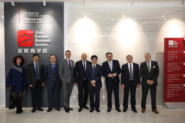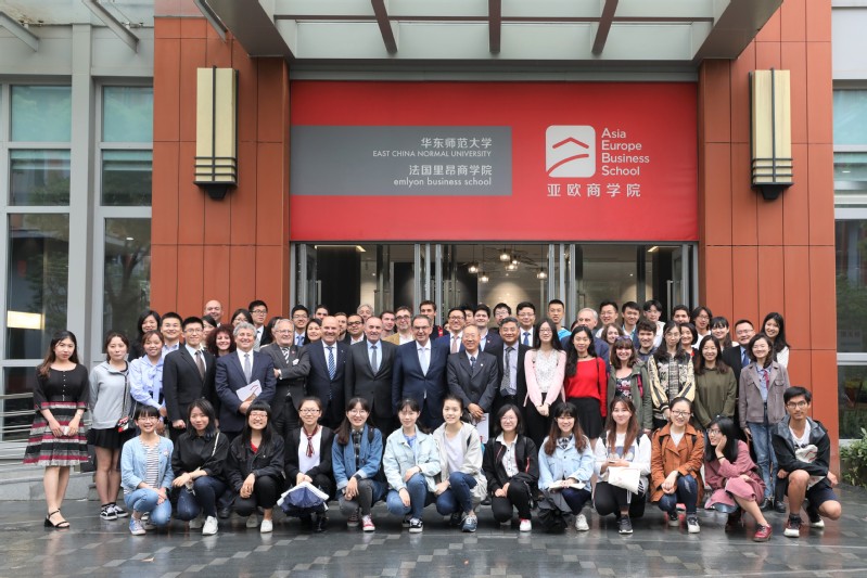 5月5日下午,法国里昂大都会区主席David KIMELFELD一行访问华东师范大学与法国里昂商学院合作创建的亚欧商学院,就中法两国大学教育合作进行交流。下个月的24日,是两校签署合作主协议联合创办亚欧商学院三周年的纪念日。在即将迎来亚欧商学院三周岁的日子里,随着学院近期在教学项目拓展与创新创业教育方面获得的实质性进展,法国里昂大都会区主席David KIMELFELD的到访对促进中法教育合作创新具有特别意义。我校党委书记童世骏代表学校欢迎David KIMELFELD一行,法国驻沪总领事Axel Cruau、里昂商学院董事局主席Bruno BONNELL、里昂商学院校长Bernard BELLETANTE、里昂大学校长Khaled BOUABDALLAH、新里昂大学副主席Alain LABAT,我校国际交流处处长周云轩、经济与管理学部学术委员会主任袁志刚,紫竹国际教育园区总经理唐继锋等出席,亚欧商学院、法国里昂商学院和经管书院的80余名学生参加本次活动。活动由我校经济与管理学部副主任、亚欧商学院中方院长何佳讯和法国里昂商学院亚洲校区校长、亚欧商学院法方院长王华主持。