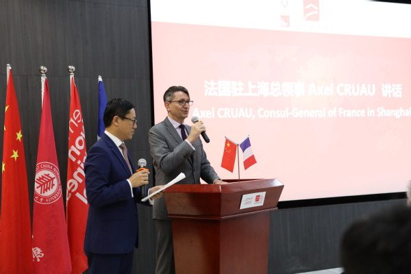 法国驻沪总领事Axel Cruau在讲话中高度赞扬了亚欧商学院的建设成果,他表示华东师范大学是与法国高等教育保持紧密友好合作关系的伙伴之一。在面临诸多挑战的当今社会,法国里昂地区希望与中国高等教育开展更多面向世界、展望未来的创新性合作。他希望,此类合作对学生、企业家和未来管理者而言,必将成为中法两国合作成功的典范。