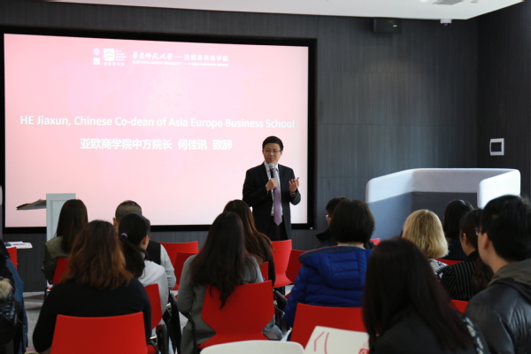 在欢迎仪式上,华东师大亚欧商学院中方院长何佳讯教授代表学院向所有来宾表示欢迎,并简要介绍了亚欧商学院的创办历程,以及华东师大与里昂商学院两校的办学优势。他向来访的学生们提出两个问题,启发大家思考,一是职业与事业的关系与差别;二是怎样的力量能让世界变得更加美好,最后鼓励大家从长远发展的视角审思今天的行动和选择。