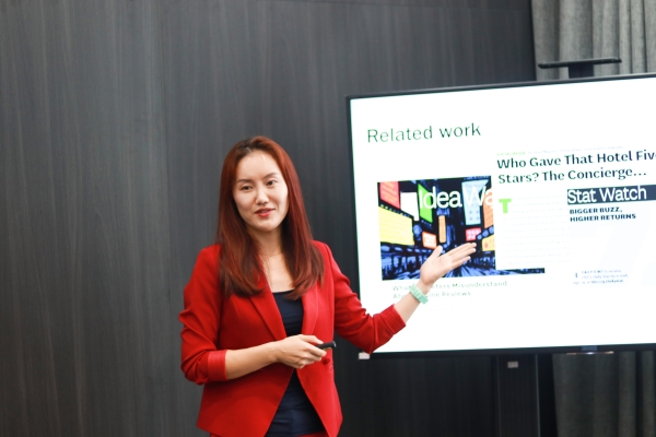 来自里昂商学院亚洲校区的研究助理教授Spring HAN老师以“文本分析和在线客户评论”为题,通过研究实例为师生讲述了文本分析方法在学术研究中的具体应用。研究以456家位于俄罗斯莫斯科的酒店进行为期两年的研究为基础,展开了一系列定量分析,针对三大具体问题进行详细阐述,包括:相对于数字评分而言,我们是否会从文本评论中获得更多的见解?如何将用户情感与评分进行一一对应?在这些评论中,有哪些潜在的主题在类似的酒店板块中具有广泛一致性?在报告最后,基于研究模型,Spring HAN教授对研究结果进行了总结,得出文本信息能够极大地提高企业了解客户以及预测企业绩效的能力。杨菲菲老师从专业学术的角度肯定了该项研究所采取的定量分析方法,并针对其在具体实践环境中的应用提出了独到的见解。
