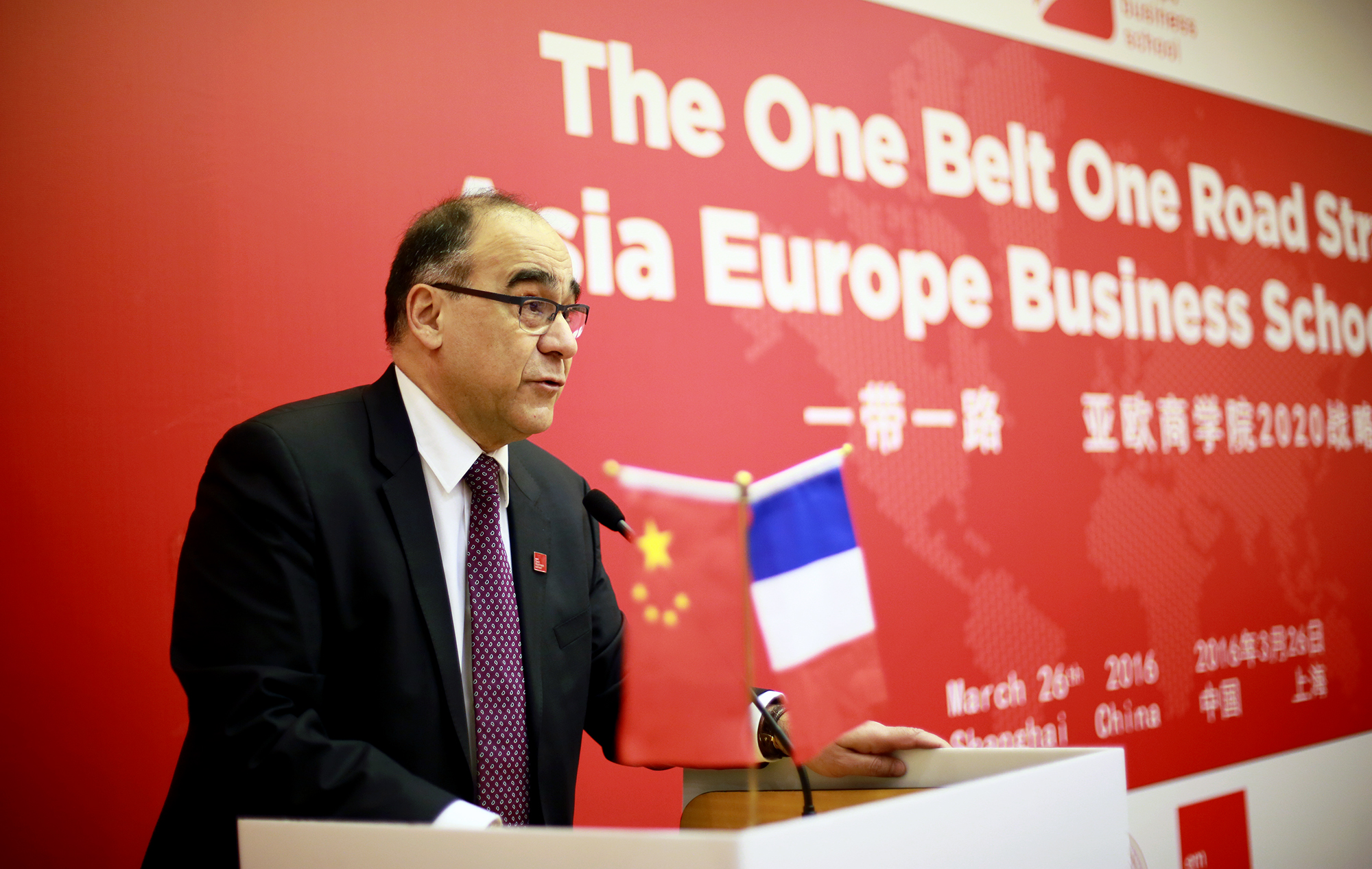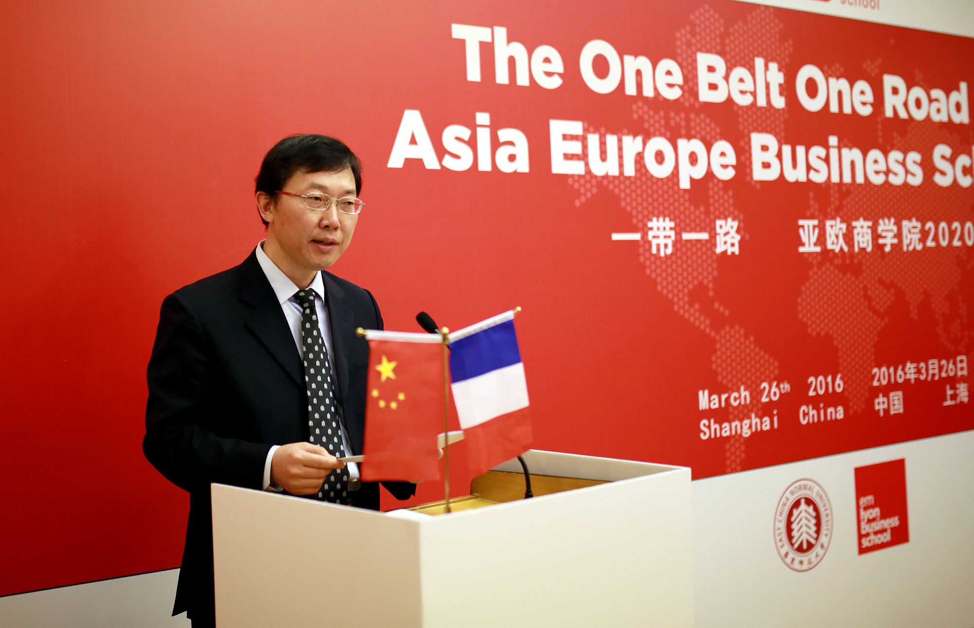法比尤斯先生在讲话中首先感谢华东师大的热情接待,并指出,亚欧商学院的办学理念新颖独特,办学双方——华东师大与里昂商学院特色鲜明、信心十足,加上来自政府、企业多方的支持,相信亚欧商学院会为两国的教育合作、人才培养做出新的贡献。法比尤斯先生讲话中特别对亚欧商学院的英文简写“AEBS”中的“AE”给出了新的诠释:A代表Alliance和Association(联盟),象征亚、欧、非三大洲的联结,共创商科未来的世界三角洲;E不仅代表Entrepreneurship(企业家精神),更代表Excellence(卓越),这种卓越已经体现在华东师大与里昂商学院共同为建设亚欧商学院所付出的辛勤工作中,更将是未来亚欧商学院发展成果的完美诠释。最后,法比尤斯先生重申了对项目的倾情支持并衷心期盼亚欧商学院为中法教育合作再划新篇章。