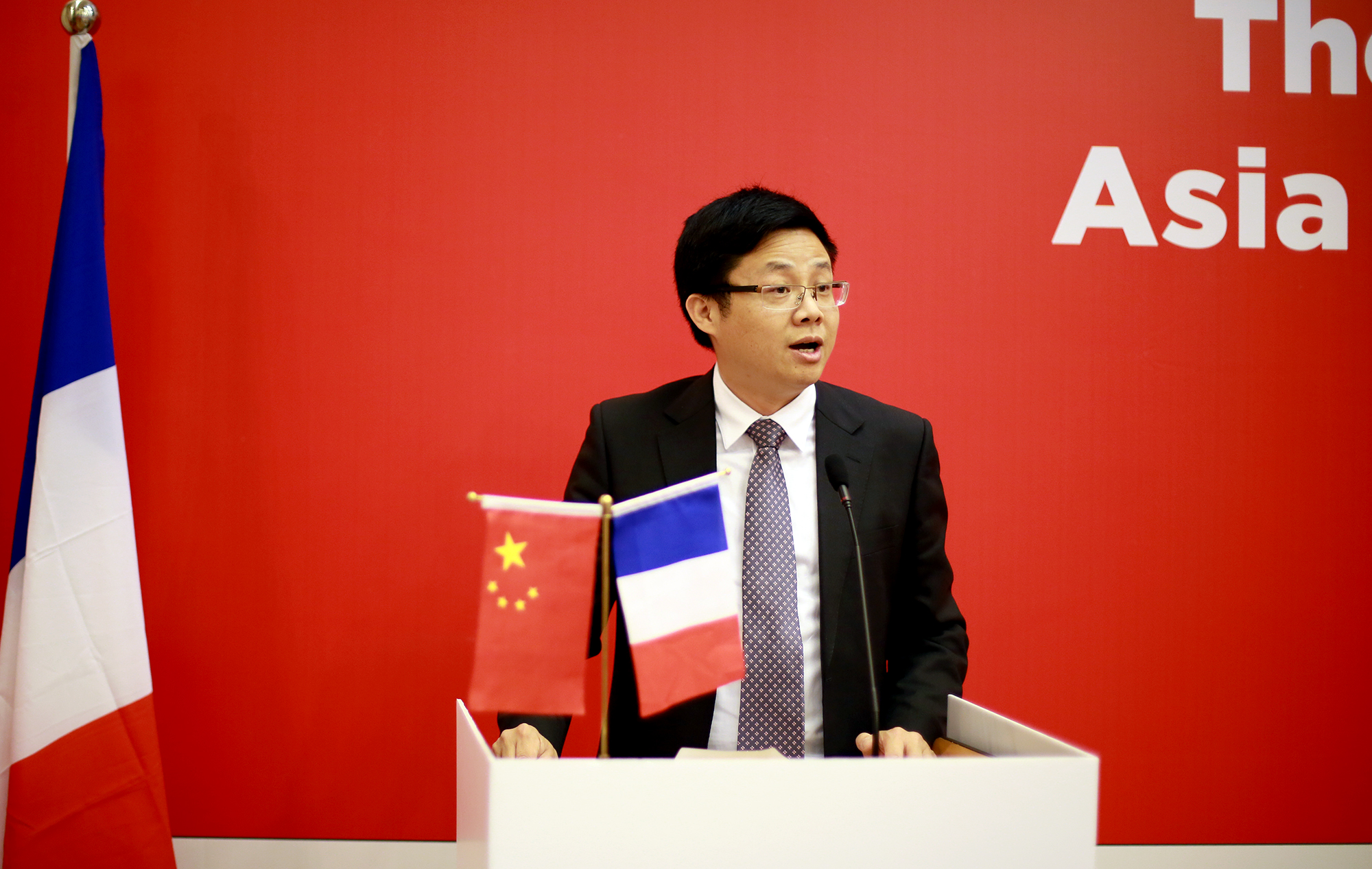 法国驻沪总领事柯瑞宇先生在致辞中高度赞赏了华东师大与里昂商学院多年来通过紧密合作共同为中法人才培养、文化交流所作出的贡献。他指出,华东师大与里昂商学院在多年合作基础上共建的亚欧商学院具有很强的象征意义,既象征着中法合作尤其是在高校层面的合作得到了进一步的加强,也象征着华师大多年来与法国高校建立的紧密、友好关系更上一层楼,还象征着中法学生培养开启了新的篇章,前景充满希望。柯瑞宇表示,法国驻沪总领事馆非常支持亚欧商学院项目,该项目无论是对于两国学生还是两国发展都具有十分积极的作用。他期待数月后在闵行紫竹国际教育园区见证亚欧商学院教学楼的正式启用,并衷心祝愿亚欧商学院早日培养出社会需要的顶尖商科人才。