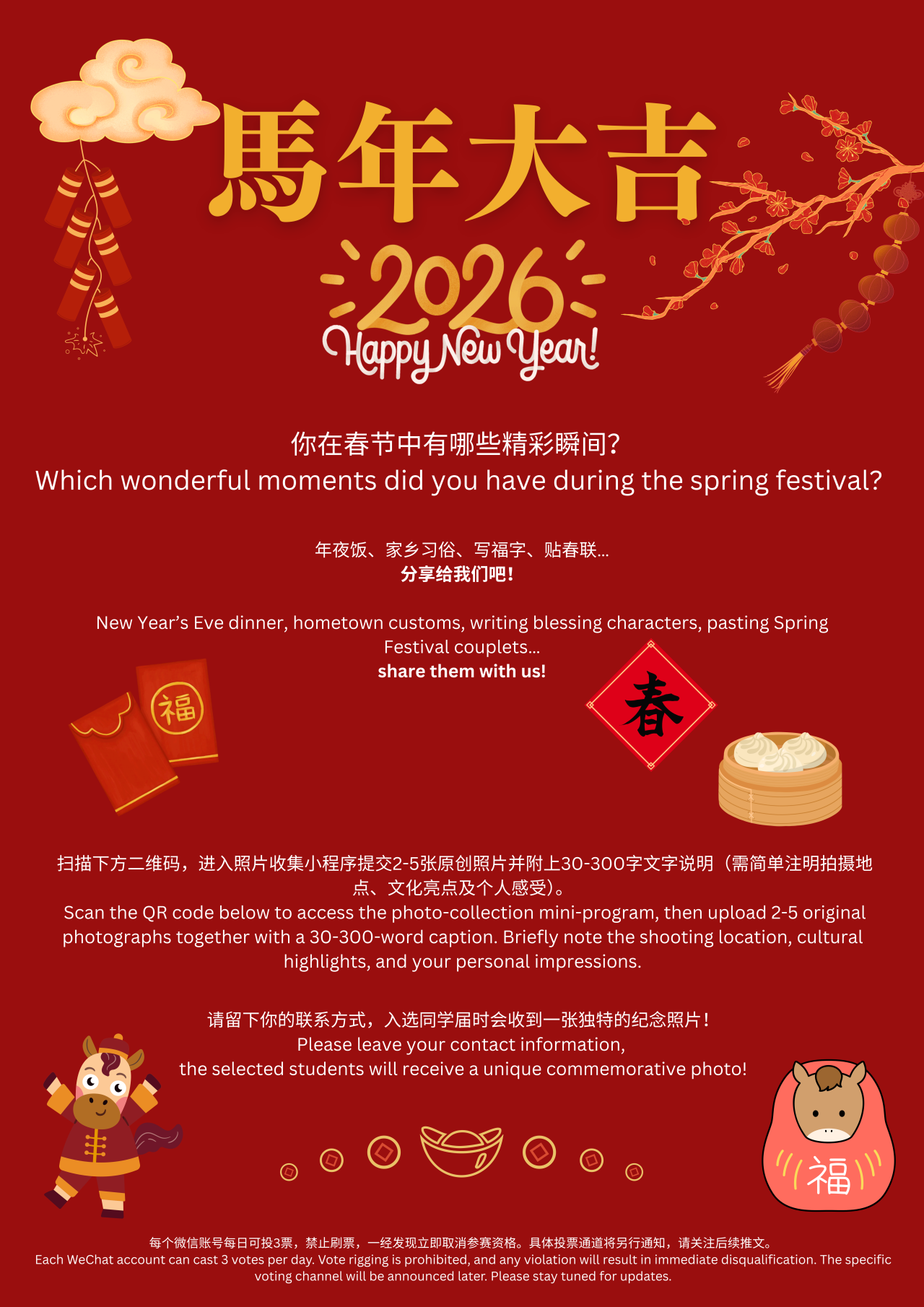 This event will use a mini-program to collect participants 'unique experiences and feelings during the Spring Festival, including photos of the New Year's Eve dinner, local Spring Festival customs, the character 'Fu' (symbolizing good fortune), Spring Festival couplets, and other Year of the Horse-themed content. After being selected by staff, these photos will be added to a voting mini-program, where students and teachers can cast their votes for their favorite entries!